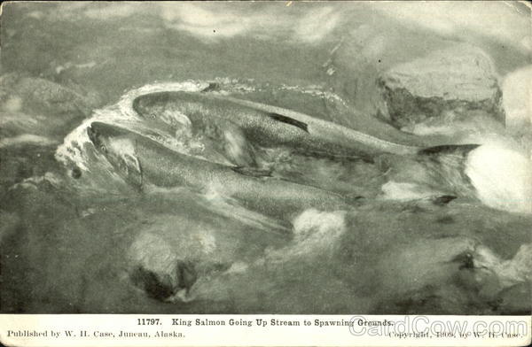 Front: 11797. King Salmon Going Up Stream to Spawning Grounds. Published by W. H. Case, Juneau, Alaska. Copyright, 1909, by W. H. Case. Back: 1,50 THIS SPACE CAN BE USED FOR A WRITTEN MESSAGE, USING ONE-CENT STAMP TWO CENTS