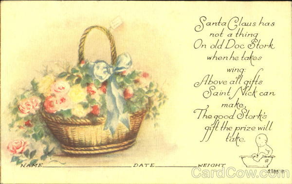 Front: Santa Claus has not a thing On old Doc Stork when he takes wing: Above all gifts Saint Nick can make, The good Stork's gift the prize will take. NAME DATE. WEIGHT ge 1185 B Back: COMMUNICATION