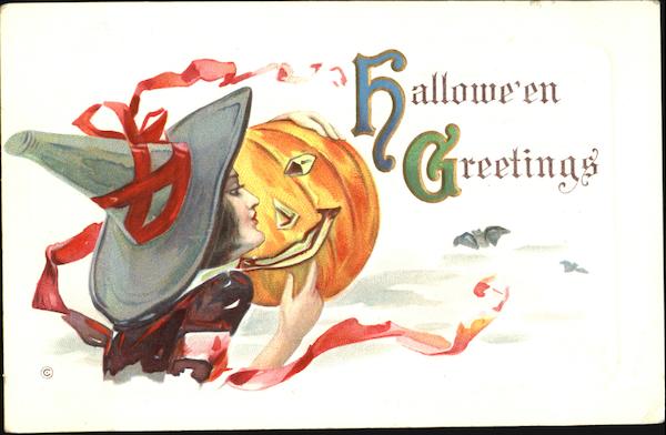 Series 332-E Pretty Witch Kissing Pumpkin Halloween Greetings