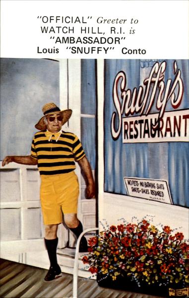 "Official" Greeter to Watch Hill, Rhode Island, is, "Ambassador" Louis "Snuffy" Conto, Proprietor of "Snuffy's" Restaurant, Bay Street, Watch Hill, R. I. Open from April - October, serving breakfast - luncheon-dinner. Overlooking colorful Little Narragansett Bay. Italian / American dishes, seafood specialties. |
