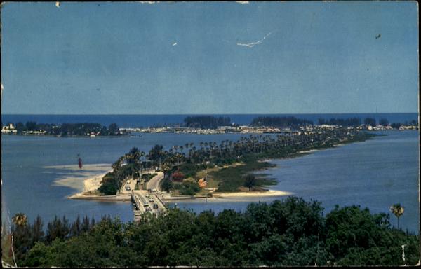 Aerial in natural color showing Memorial Causeway from City of Clearwater to Clearwater's beautiful white sand beach