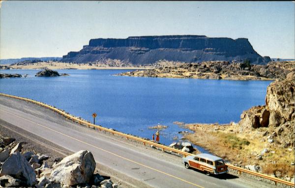 | A landmark in the Grand Coulee of Washington. In the upper Coulee a balancing reservoir has been formed to store water pumped from the Columbia river by the reserve power from Grand Coulee Dam. This will provide irrigation for 1,200,000 acres ultimately to be developed in south Central Washington. |