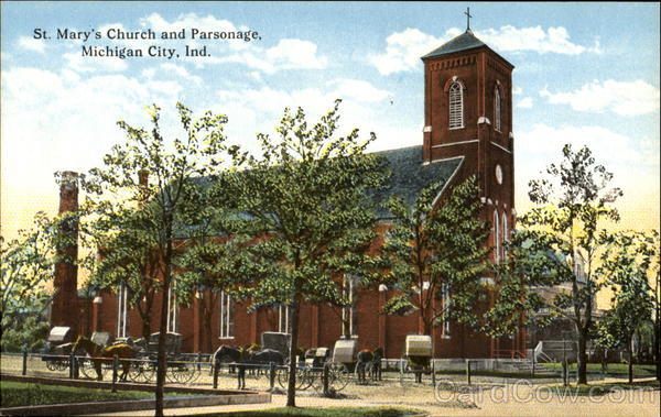 Front: St. Mary's Church and Parsonage, Michigan City, Ind. Back: PUBLISHED BY GEO. LEUSCH, MICHIGAN CITY, IND. A-38430 PHOTOCHROM THIS SPACE FOR ADDRESS ONLY.