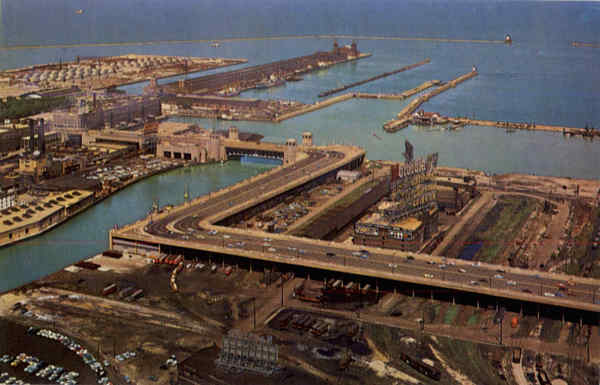 Published by Cameo Greeting Cards, Inc., Chicago, Illinois Jelly VIEW LOOKING EAST SHOWING OUTER DRIVE Chicago, Illinois CHICAGO, "The City Beautiful" Plastichrome® by COLOURPICTURE PUBLISHERS, INC., Boston 30, Mass., U.S.A P30897 HERE