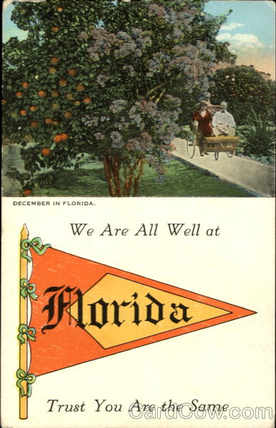 Front: DECEMBER IN FLORIDA. We Are All Well at Florida Trust You Are the Same Back: 2- A-80871 OR TED MESSAGE MAY BE WRITTEN ON THIS SIDE Greetings Mrs. B. Caffrey. Killingly Connecticut turs Handall R.A.D.Z