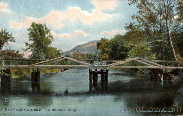 In 1664, the Norwottuck Indians, of whom the lands were bought by the first settlers, were allowed to build forts on condition that they would not harbor hostile Indians, nor violate the Sabbath by carrying burdens. One of the these forts was located on what is now known as Fort Plain, the plateau in the rear of the site of the oldEast Street school-house, overlooking the meadows of the Manhan and Connecticut. The bridge seen in the picture is at the foot of the plateau. Here was the last residence of Indians within the limits of Easthampton. At the opening of King Philip's War, in 1675, they joined the hostile forces, and quitted the land of their nativity. |