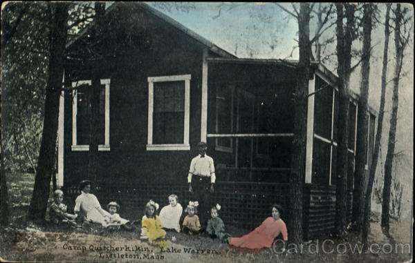 Front: [] Camp Quicherkikin, Lake Warren Littleton, Mass. Back: New England Stationery Co. Boston 56 20 DOST CARD HIS SPACE FOR CORRESPONDENCE HERE