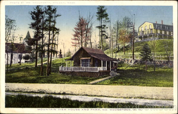Front: PHOTO BY WM. HALLWORTH, MALDEN, MASS. MOUNTAIN VIEW HOUSE AND PARK, NO. WOODSTOCK, N. H. Back: Pub. by Colesworthy Book Store, Boston, Mass. 507 NEN BOSTON CASCADE STUDIO, NO. WOODSTOCK, N. H.