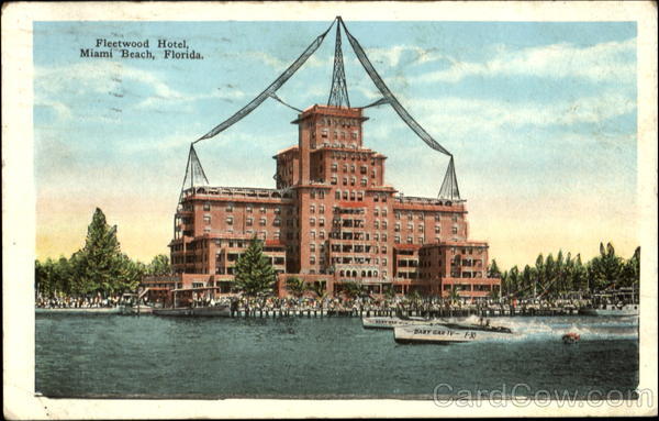 The Fleetwood Hotel, fire-proof, 15 stories, accommodating 700 guests. Roof garden seating 800 people, with dance floor 230 feet long, overlooking the Ocean and Bay, Broadcasting Station WMBF, tune in at 330 meters.