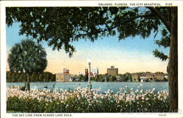 Front: ORLANDO, FLORIDA, THE CITY BEAUTIFUL. THE SKY-LINE FROM ACROSS LAKE EOLA. 105198 0.52 Back: BEAUTIF PUBLISHED BY ASHEVILLE POST CARD CO. ASHEVILLE, N. C. MADE IN USA FLORIDA 150 CE 77
