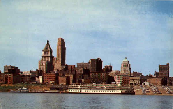 | Skyline of Cincinnati, Ohio, from the Kentucky shores of the Ohio River. The tallest building is the Carew Tower which is 48 stories and rises 574 feet above street level. In the foreground is the Delta Queen at its home port, the only overnite passenger steamer on the River |