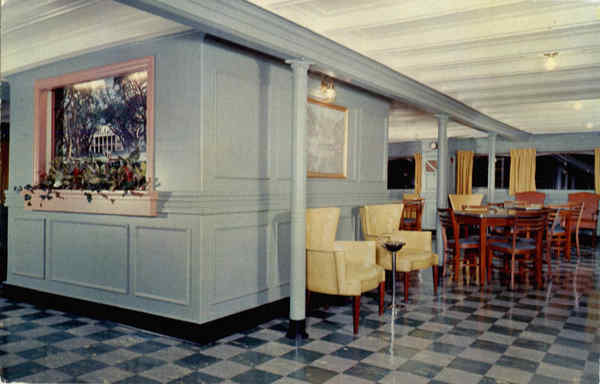 Observation Lounge on the S.S. Delta Queen, owned by Greene Line Strs. Inc., Cincinnati, Ohio. The Delta Queen is a modern air conditioned, oil burning, passenger steamer, making one to three week tours on the Ohio, Mississippi and Tennessee Rivers |