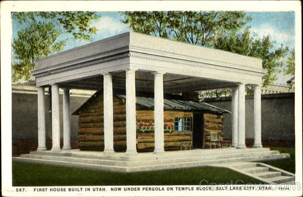 | The First House built in Utah was erected in 1847. under the direction of Brigham Young, by the Pioneers who reached Salt Lake Valley July 24th of that year. The material used was rough logs, and slabs cut from same for the roof. The crevices between logs were filled with mud. |