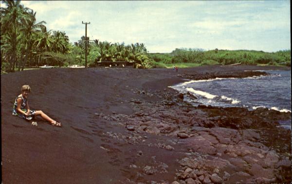 About an hour's drive south of Hilo is one of Hawaii's most fantastic and unusual points of interest - a ruggedly beautiful black lava coastline and a beach of shinning black fine grained sand