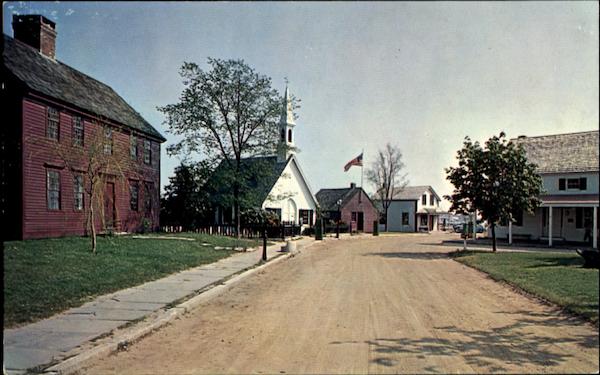 Mystic Seaport at the Turn of the lane. The Buckingham House at the left and the Schaefer Tavern on the right, Fishtown Chapel, the little Red Schoolhouse, and the General Store are features of the Seaport's reconstructed seafaring community. |