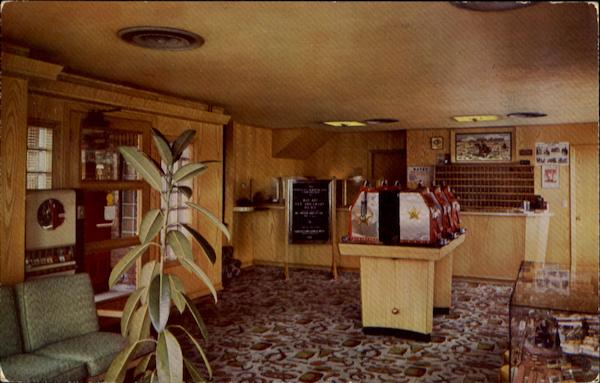 The lobby of this magnificent new motel, just east of Reno on U.S. Highway 40, offering hotel services with all motel advantages. Approved by AAA. Member United Motor Courts.