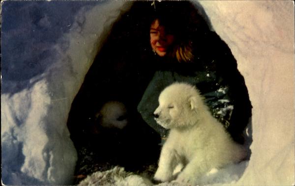 COLOR PHOTOGRAPH BY MAC'S FOTO SERVICE ESKIMO BOY . . playing with two pet polar bear cubs in a native igloo or snow house on arctic Barter Island. ALASKA NATURAL COLOR A-9 MIRRO-KROME CARD BY H. S. CROCKER CO., INC., SAN FRANCISCO 1