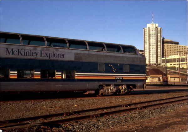 Front: McKinley Explorer WTMC 508 Back: McKinley Explorer Anchorage Denali • Fairbanks #18051 McKinley Explorer in downtown Anchorage. Photographer-Carl Cox alaska © 1993 Impact, Woodinville, WA 98072
