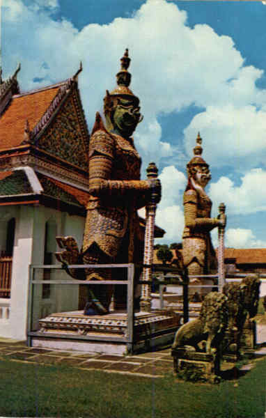 No. 29/07: WAT AROON, Thonburi/Thailand. Standing on their posts, these two monstrous figures have been put as the guards of the temple. Phikoon Store 330 Nakornsawan Road, Bangkok, Thailand. STAMP