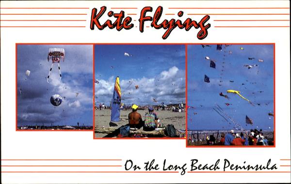 Front: Kite Flying On the Long Beach Peninsula — Back: KITE FLYING The expanse of Peninsula beaches offer the kite flyer a fantastic place to engage the wind. apsh. ©Pub. by PHOTO'NEIL, Box 1004, Long Beach, WA 98631 CP8925
