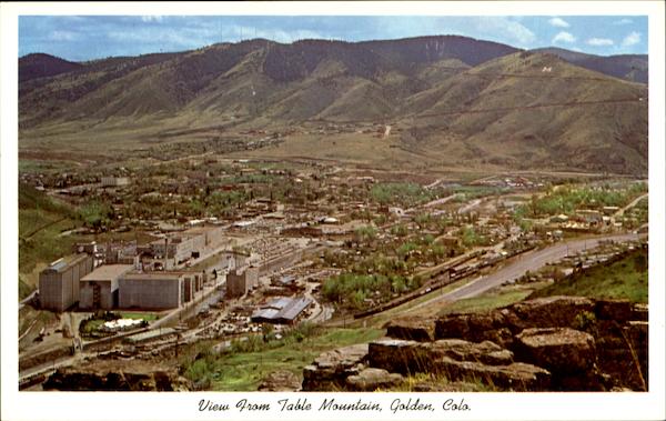 Golden, showing the Coor's Brewery in the foreground with the ?M? for the Colorado School of Mines and the Lariat Trail to Buffalo Bill's grove in the background. The highway is the shortest route to Central City and Idaho springs through scenic Clear Creek Canyon. |
