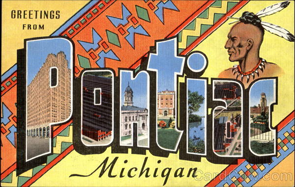 Front: GREETINGS ロロロロロロ! 000 Michigan Back: 28631N KEY TO VIEWS ON OTHER SIDE:-- P-Peoples State Building 0-Home of the Pontiac Auto N_Court House T-St. Joseph's Mercy Hospital I -Orchard Lake A-Fisher Body Plant C—Cranbrook School For Boys K к CO