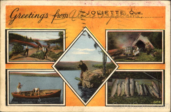 Front: Greetings foem L JOLIETTE, QUE. GF4 Back: CARB EKST SEP 4 6 AM 1942 Chanese mama Do CENTE alma Chapdeline Ecoile Camance on your strensils Lo PHOTOGELATINE ENGRAVING CO., LIMITED, OTTAWA. Monday 99 Norrid St Ma ous bein СО OTTAWA