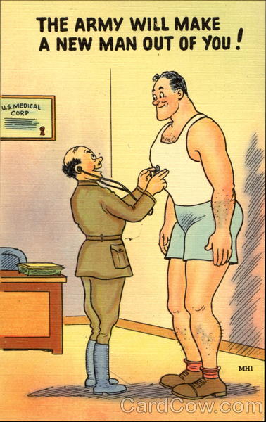 Front: THE ARMY WILL MAKE A NEW MAN OUT OF YOU! U.S.MEDICAL CORP MH1 Back: MADE IN U. S. A "TICHNOR QUALITY VIEWS" REG. U.S. PAT, OFF. MADE ONLY BY TICHNOR BROS., INC., BOSTON, MASS, 70483