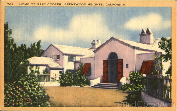 Front: 782 HOME OF GARY COOPER, BRENTWOOD HEIGHTS, CALFORNIA Back: 2,50 MANUFACTURED BY LONGSHAW CARD CO., LOS ANGELES, CALIF. Oo oo