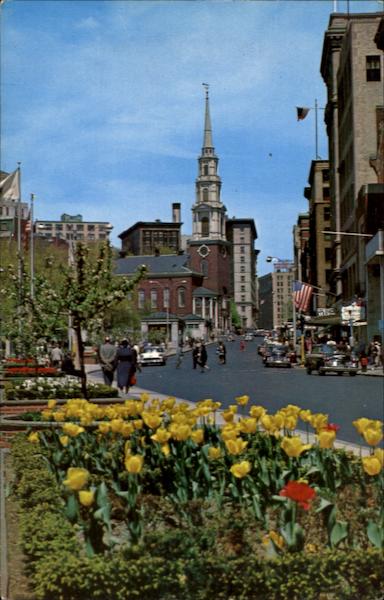 PARK STREET CHURCH FROM TREMONT STREET MALL, BOSTON, MASS. BM-159-Color photo by Fred Jellison, Jr. -Published by Bromley & Company, Inc., Boston, Mass. 02210- COLOR BY MIKE ROBERTS BERKELEY, CALIF. 94710 C14092 U.S.A.