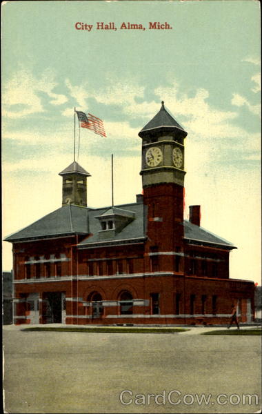 Front: City Hall, Alma, Mich. Back: 8683-CUSHING & BENEDICT, PUBLISHERS. ALMA, MICH. Domestic and Two Cents