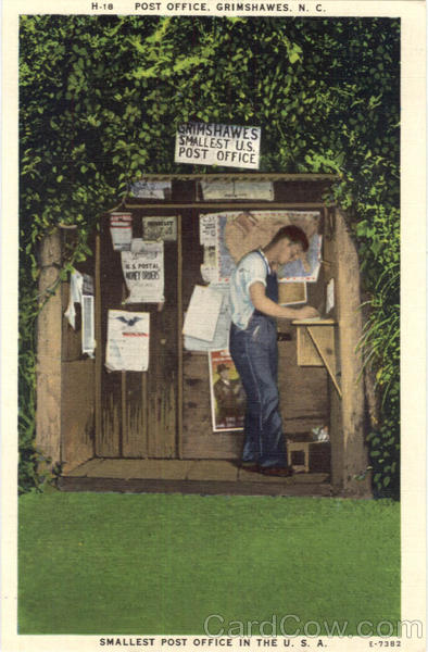H-18 POST OFFICE. GRIMSHAWES. N. C. GRIMSHAWES SMALLEST U.S. POST OFFICE uS POSTAL ET ORIERS E-7382 SMALLEST POST OFFICE IN THE U. S. A.
