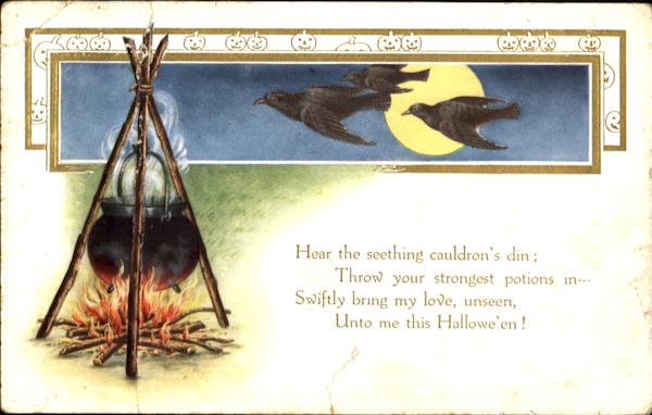 Hear the seething cauldron's din; Throw your strongest potions in Swiftly bring my love, unseen, Unto me this Hallowe'en!