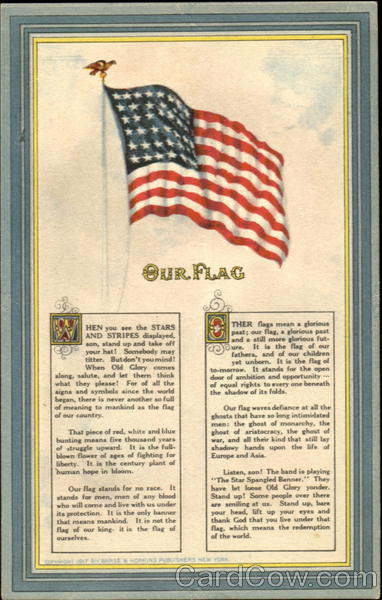 When you see the stars and stripes displayed, son, stand up and take off your hat! Somebody may titter. But don't you mind! When Old Glory comes along, salute, and let them think what they please! Fo of all the signs and symbols since the world began, there is never another so full of meaning to mankind as the flag of our country. That piece of red, white and blue bunting means five thousand years of struggle upward. It is the full blown flower of ages of fighting for liberty. It is the century plant o human hope in bloom. Our flag stands for no race. It stands for men, men of any blood who will come and live with us under its protection. It is the only banner that means mankind. It is not the flag of our king it is the flag of ourselves. Ther flags mean a glorious past; our flag, a glorious past and a still more glorious future. It is the flag of our fathers, and of our children yet unborn. It is the flag of to-morrow. It stands for the open door of ambition and opportunity – of equal rights to every one beneath the shadow of its folds. Our flag waves difiance at all the ghosts that have so long intimidated men; the ghost of monarchy, the ghost of aristocracy, the ghost of war, and all their kind that still lay shadowy hands upon the life of Europe and Asia. Listen, son! The band is playing “The Star Spangled Banner.” They have let loose Old Glory yonder, Stand up! Some people over there are smiling at us. Stand up, bare your head, lift up your eyes and thank good that you live under that flag, Which means the redemption o the world. |