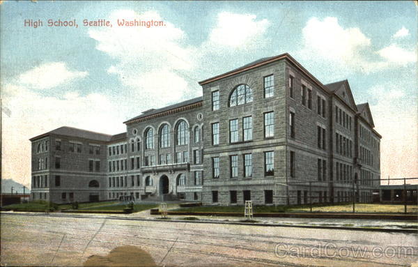 Front: High School, Seattle, Washington. Back: No 5043. Publ. by Portland Post Card Co., Portland, Ore. and Seattle, Wash. (Made in Germany). Write here. 1.00 Cuba 2 c