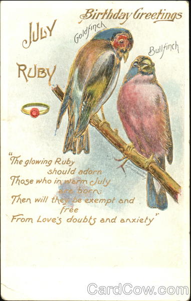 Goldfinch, Bullfinch. “The glowing Ruby should adorn Those who in warm July are born; then will they be exempt and Free From Love's doubts and anxiety.”