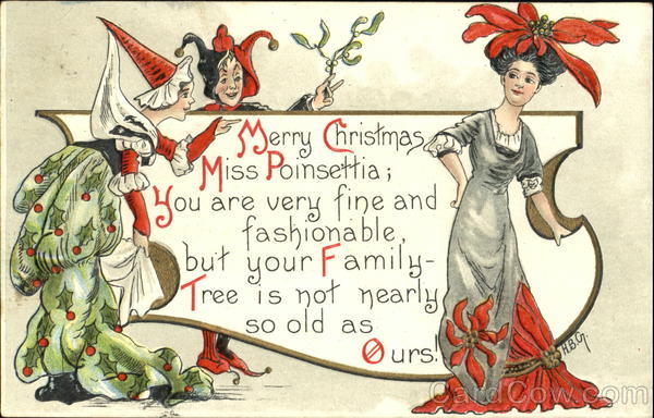 Merry Christmas Miss Poinsettia; You are very fine and fashionable, but your Family tree is not nearly so old as Ours!