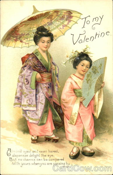 Almond eyed and raven haired, Japanese delight the eye; But no charms can be compared With yours when you are passing by.
