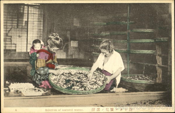 Front: Selection of matured worms. 擇選兒蚕ルダシ Back: 130 Cartolina postale - Dopisnice - Levelezo-Lap Correspondenz karte Karta korespondencyjna - Briefkaart Tarjeta postal - Brefkort Brevkort Открытое письмо MADE IN JAPAN きかは便