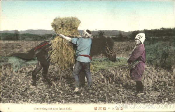Front: Conveying cut rice from field. 搬運稻ㄦㄨ达刈 Back: Cartolina postale - Dopisnice - Levelezo-Lap - Karta korespondencyjna - Briefkaart Tarjeta postal Brefkort Brevkōrt OTKPLITO UCLMO Correspondenz karte MADE IN JAPAN きかは便郵