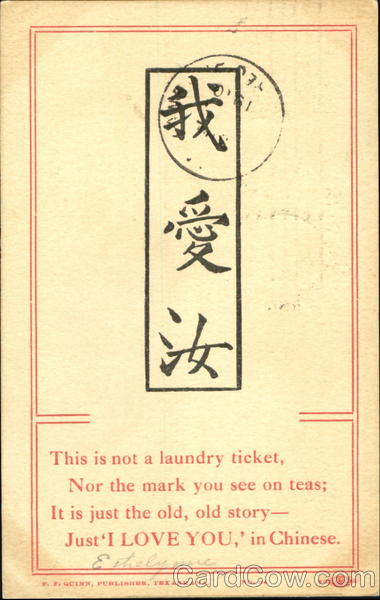 This is not a laundry ticket, Nor the mark you see on teas; It is just the old, old story Just 'I Love You,' in Chinese.