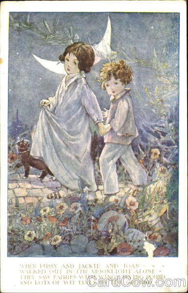 When pussy and Jackie and Joan walked out in the moonlight alone they saw fairies with wings flying round and lots of wee elves on the ground
