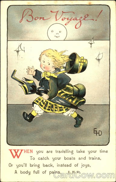 When you are traveling take your time To catch your boats and trains, Or you'll bring back, instead of joys, A body full of pains