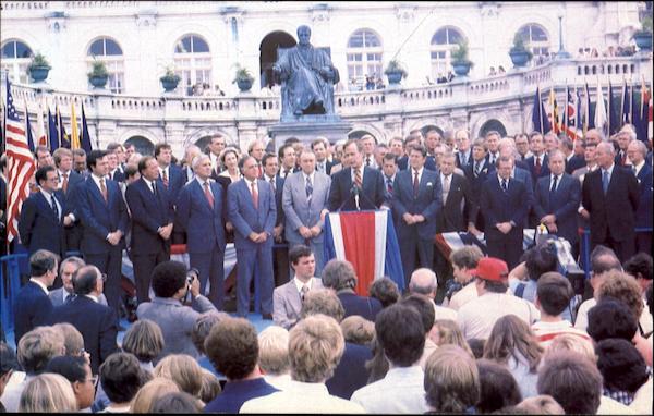 | Vice-Presidential candidate George Bush talks to campaign workers as Ronald Reagan looks on. Speaking of the Reagan-Bush administration, Bush calls for a close working relationship with Congress and a reduction in government regulations. |