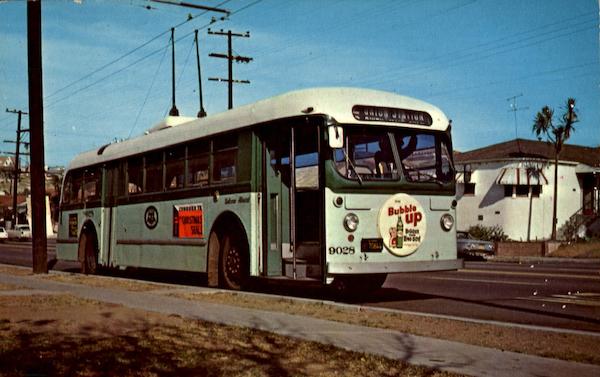 | Many of the advantages of both the trolley car and the motor bus were apparent in the trolley bus although most systems have been discontinued. No. 9028 is shown at Eastern Ave. and Woowine Drive on christmas Day 1962, on the trolley bus system abandoned in 1963. |