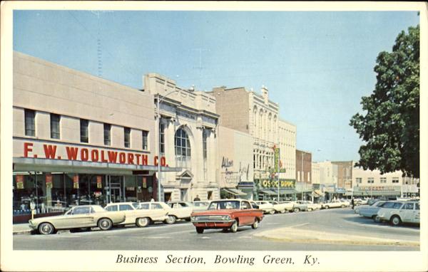 Business Section looking west, south side of Fountain Park. Bowling Green was founded 1796 by Robert Moore who built a cabin at "Big Springs" near Fountain Park. The spring and its "healing" water was a nucleus around which the town grew.