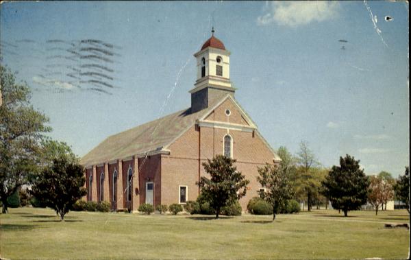 | The Protestant Chapel at Camp Lejeunes, N.C., is one of the most visited churches in the South. Stained glass windows depict combat Marines of World War I, World War II, and a huge “Victory Window,” depicting Camp Lejeunes Marines of World War II. |