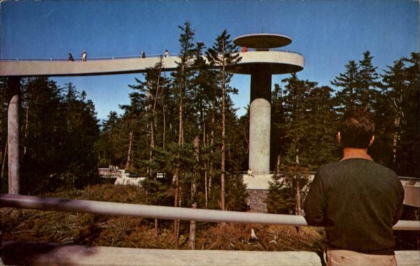 Clingmans Dome Tower Great Smoky Mountains National Park Completed in 1959, this new observation tower is on top of the Parks highest peak – elevation 6642 feet. From this point can be seen breath-taking views of the surrounding mountains in every direction. The tower is reached by an easy half-mile paved trail from the parking area on Clingmans Dome. |