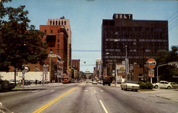 Front: KING BB&T Gulf Back: FAYETTEVILLE STREET Raleigh, North Carolina At the end of street in the distance is the State Capitol. Raleigh, founded in 1792, and named in honor of Sir Walter Raleigh. 24841 Color Photography by C. H. Ruth HERE