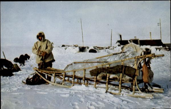 Travel in the Arctic Alaska Photo credit to Jona's Bros. Taxidermist and Furrier Anchorage Eskimo Sled and Dogs BERKELEY 2, CALIF. Mike Roberts COLOR C8679 Published by C. P. Johnston Company, Seattle, Washington